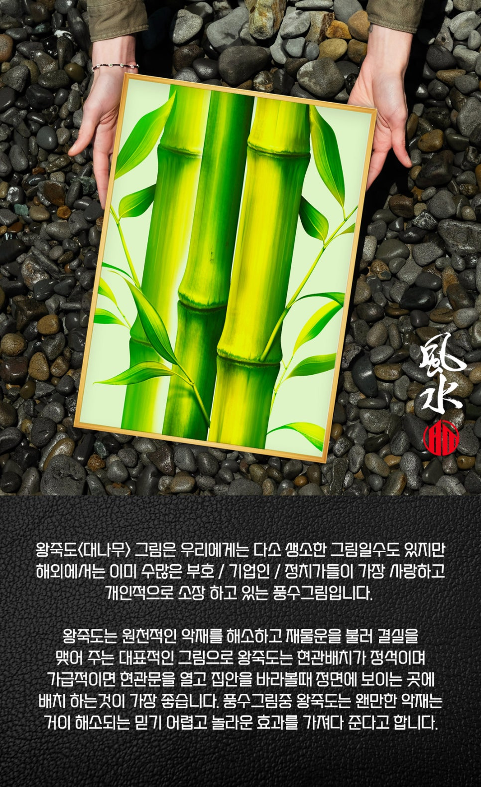 이처럼 풍수그림중 으뜸이 되는 왕죽도는 가정이든 사업장이든 악재를 해소하고 재물운을 올리는 풍수그림중 최고가 아닐까요 그림 한점으로 운명을 바꾼다는 말처럼 우리의 소중한 공간 풍수그림 한점으로 행운이 가득한 집을 만들어 보시면 좋겠습니다